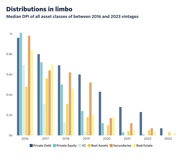 Et c’est là qu’est l’os : Les crus de 2017-2018 ne sont pas à la hauteurs et aucun secteur n’a retourné plus de 75% des mises initiales à leurs investisseurs selon une analyse de Pitchbook. Cela ne veut pas dire qu’ils ont une perte de 25% ou plus mais que les fonds ont du mal à vendre les actifs dans lesquels ils ont investi soient qu’ils aient simplement pris du retard, soient que les fonds refusent de matérialiser une perte qui risquerait de les mettre en faillite.